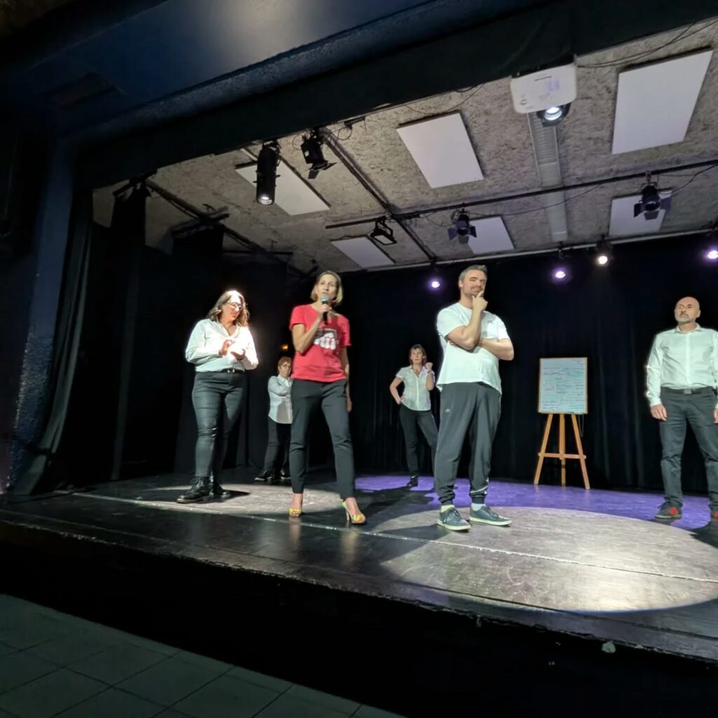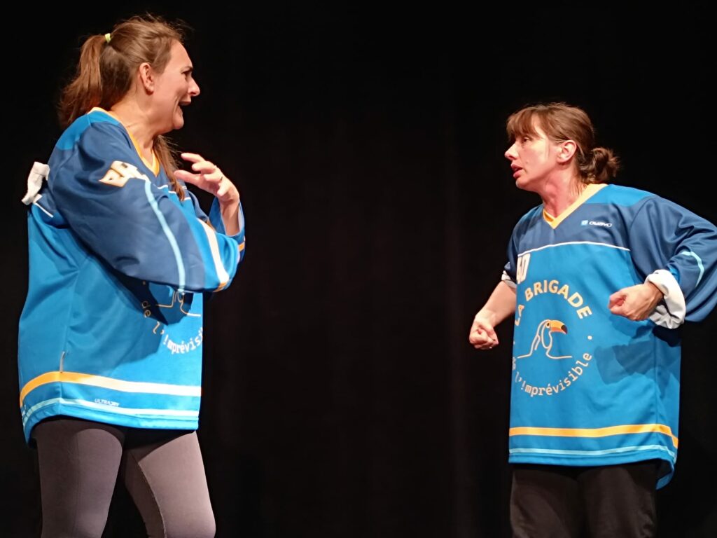 Inventé en 1977 au Québec, le match est LE format emblématique de l’improvisation théâtrale. Il s’agit d’une compétition opposant deux équipes de 4 joueurs chacune ainsi qu’un coach. Sous la supervision impitoyable d’un arbitre et de ses assistants, les équipes s’affrontent sur une patinoire transformée en scène, où chaque improvisation est chronométrée et jugée par le public. Le match se déroule généralement en 2 périodes de 45 minutes, entrecoupées d’une pause, et comprend deux types d’improvisations : les comparées, où chaque équipe joue séparément sur le même thème, et les mixtes, où des joueurs des deux équipes improvisent ensemble. Les thèmes sont tirés au hasard et annoncés par l’arbitre, tandis que les joueurs disposent de 20 secondes pour se concerter avant de commencer (c’est le caucus). À la fin de chaque improvisation, le public vote pour l’équipe gagnante, influençant ainsi le score final. En cas d’égalité à la fin du temps réglementaire, une improvisation supplémentaire est jouée pour déterminer le vainqueur. Ce format reprend les codes du hockey sur glace : les comédiens jouent en maillot de hockey, l’arbitre porte une tenue rayée…